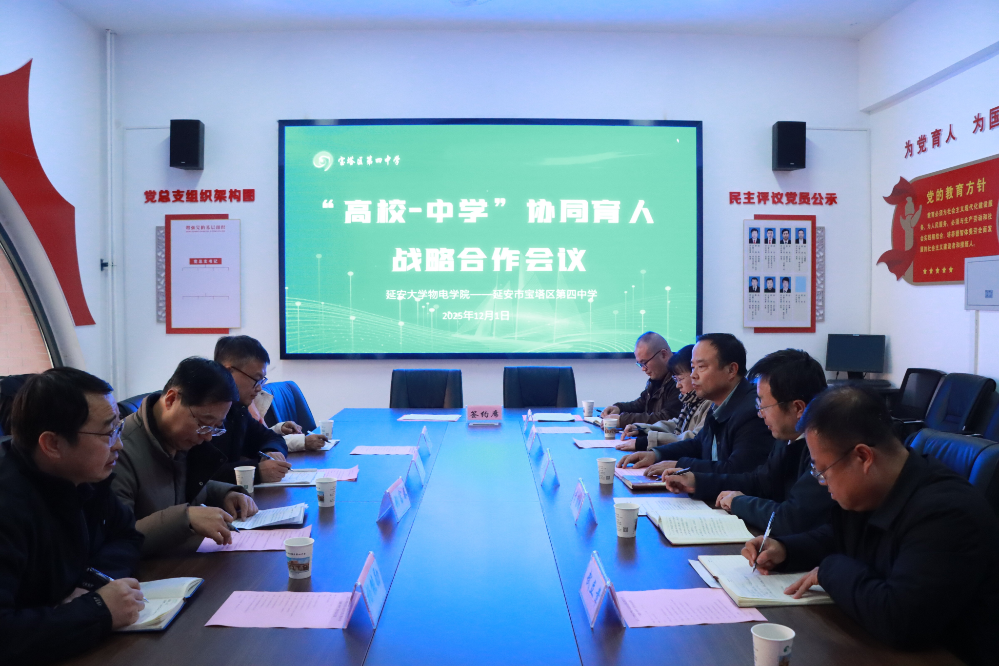 为响应新时代基础教育师资培养要求,打通高校师范教育与中学实践教学衔接壁垒,2025年12月1日下午,我院张富春院长带队与延安市宝塔区第四中学召开“高校—中学”协同育人战略合作会议暨物理师范生协同培养基地挂牌仪式。双方围绕物理学师范专业学生协同培养方案、本科培养方案、实习工作的开展等展开深度交流,为深化校地合作、提升师范生培养质量搭建沟通桥梁。会议由宝塔区第四中学教科室主任马鲁敏主持。