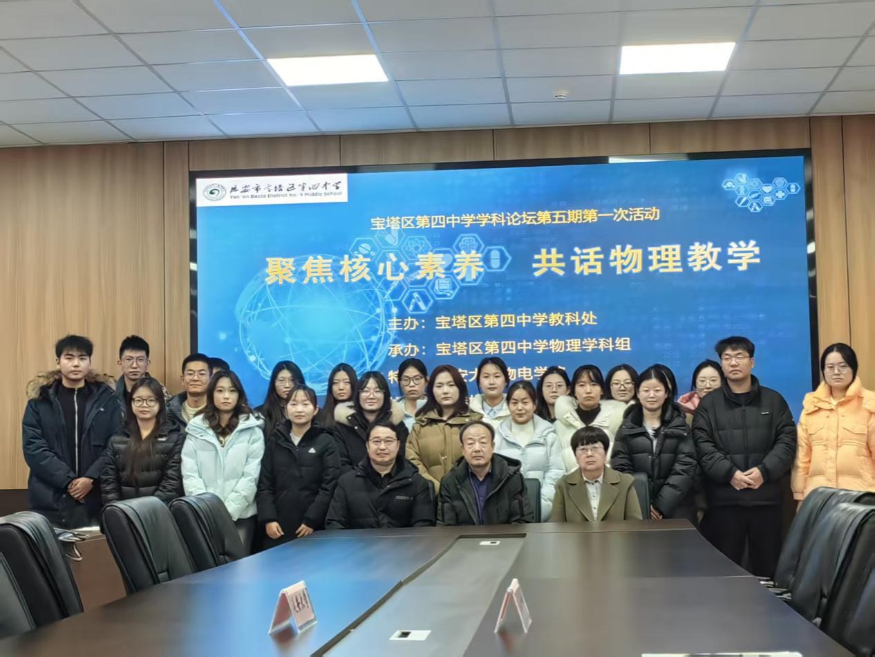 2025年12月16日下午,延安大学物理与电子信息学院任新成教授、杨能勋教授、石延梅副教授带领学科教学(物理)专业2024级和2025级共24名研究生,赴延安市宝塔区第四中学参加“聚焦核心素养,共话物理教学”学科沙龙活动。本次活动旨在深化基础教育课程改革背景下高校与中学的协同联动,推动物理教师专业发展,提升师范生培养质量。
