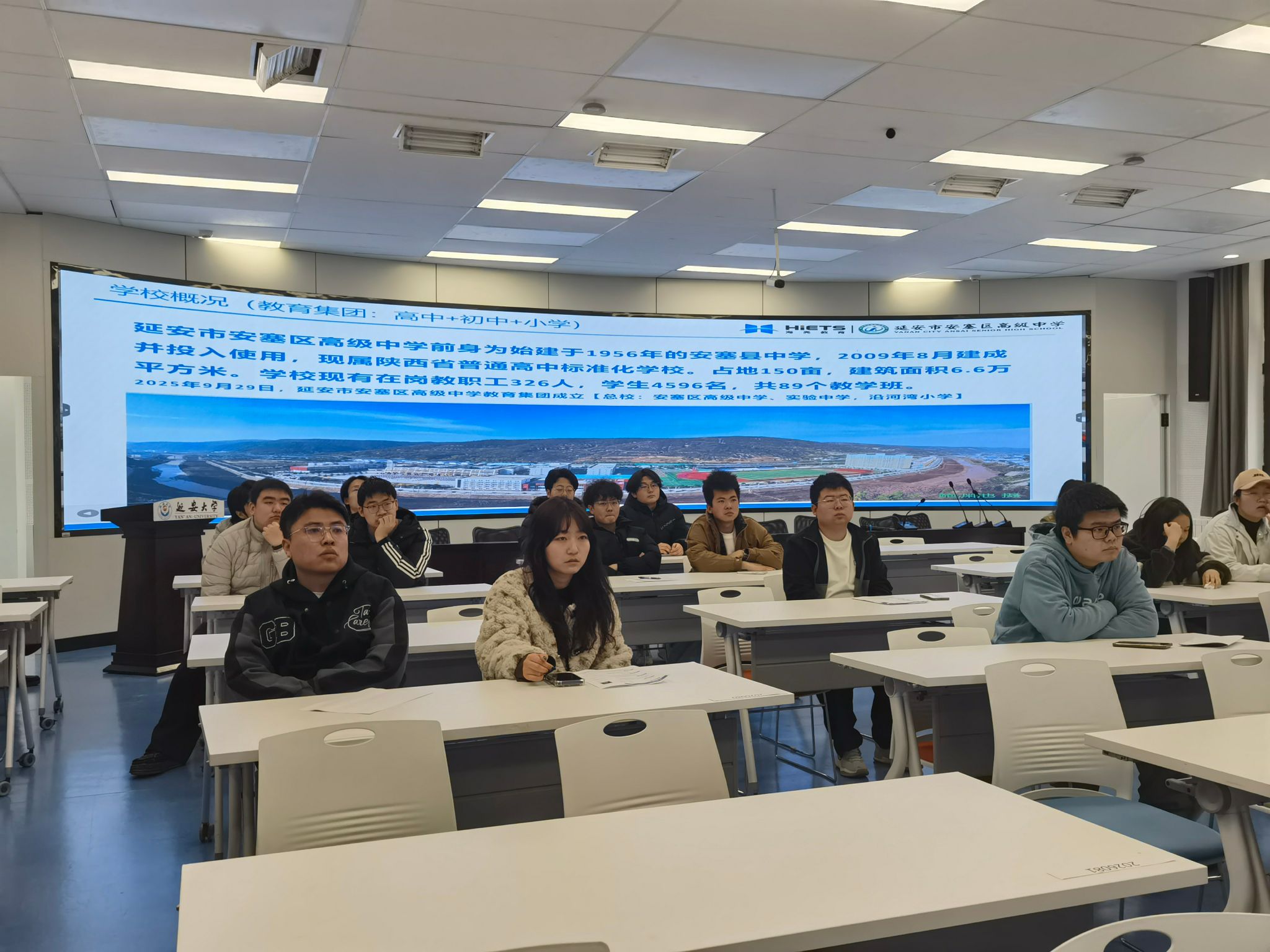 宣讲会上,延安市安塞区高级中学徐校长通过宣传片、PPT全面介绍了学校办学历史、办学理念、师资队伍建设、育人成果及发展规划,详细解读了学校对物理学科教师的岗位需求、招聘条件、培养体系、福利待遇与职业发展空间,让同学们对地方优质高中的办学实力和人才标准有了清晰认识。