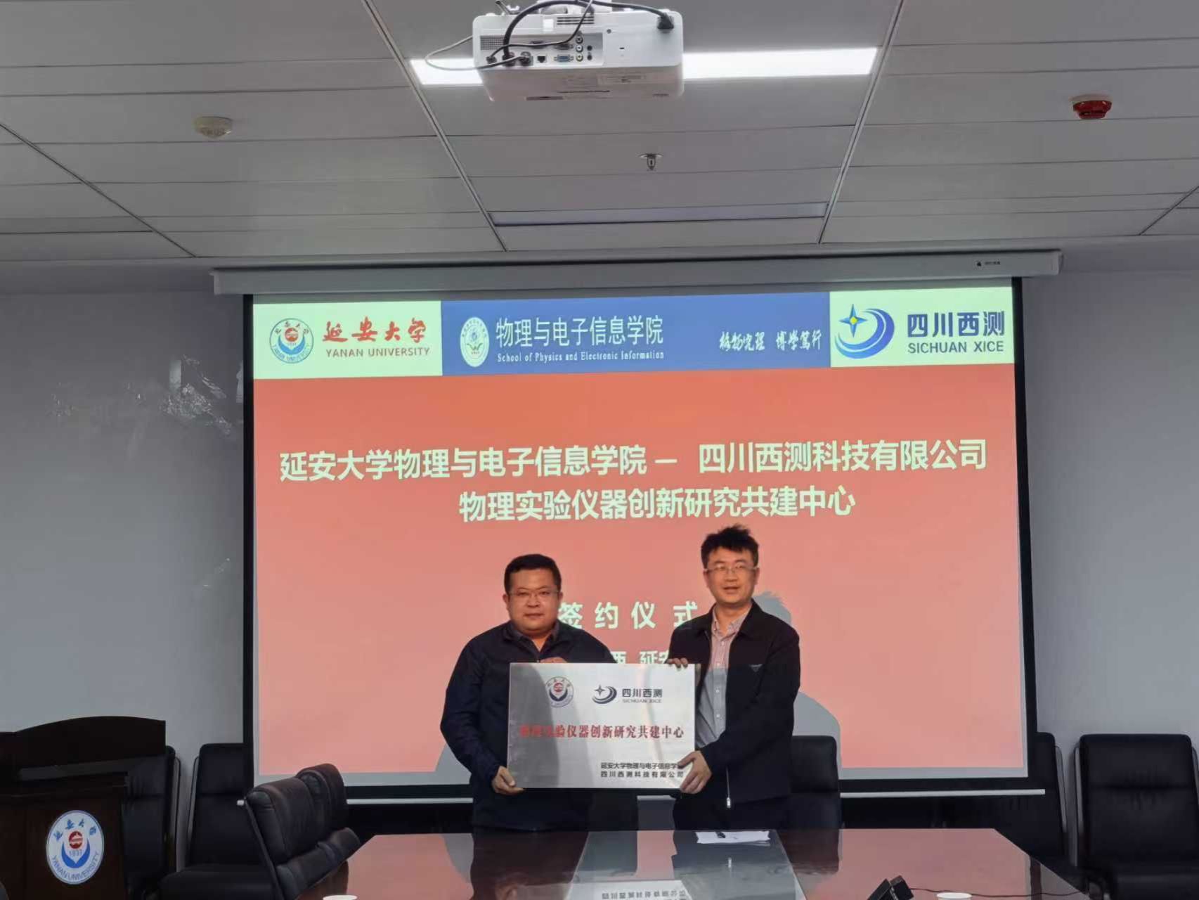 随后,双方围绕物理实验教学升级、合作模式、科研成果转化、创新人才培养等议题展开深度磋商,就共建“物理实验仪器创新研究共建中心”及“校外物理实验教学实践与研究基地”达成初步共识。何智慧副院长与赵小清总经理分别代表物电学院与四川西测科技有限公司共同签署了《延安大学物理实验仪器产学研共建中心合作协议》,并为“物理实验仪器创新研究共建中心”揭牌,同时西测公司向学院赠送了9个项目的创新实验设备,为学生创新创业实践提供了初步服务。